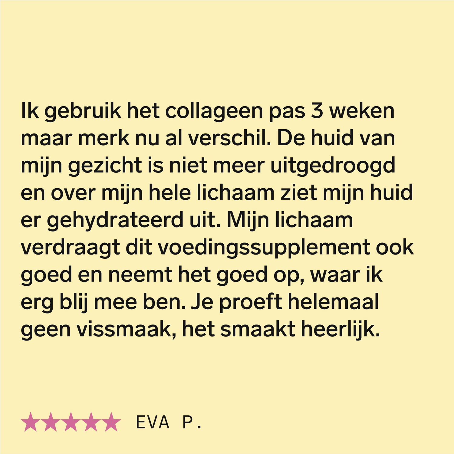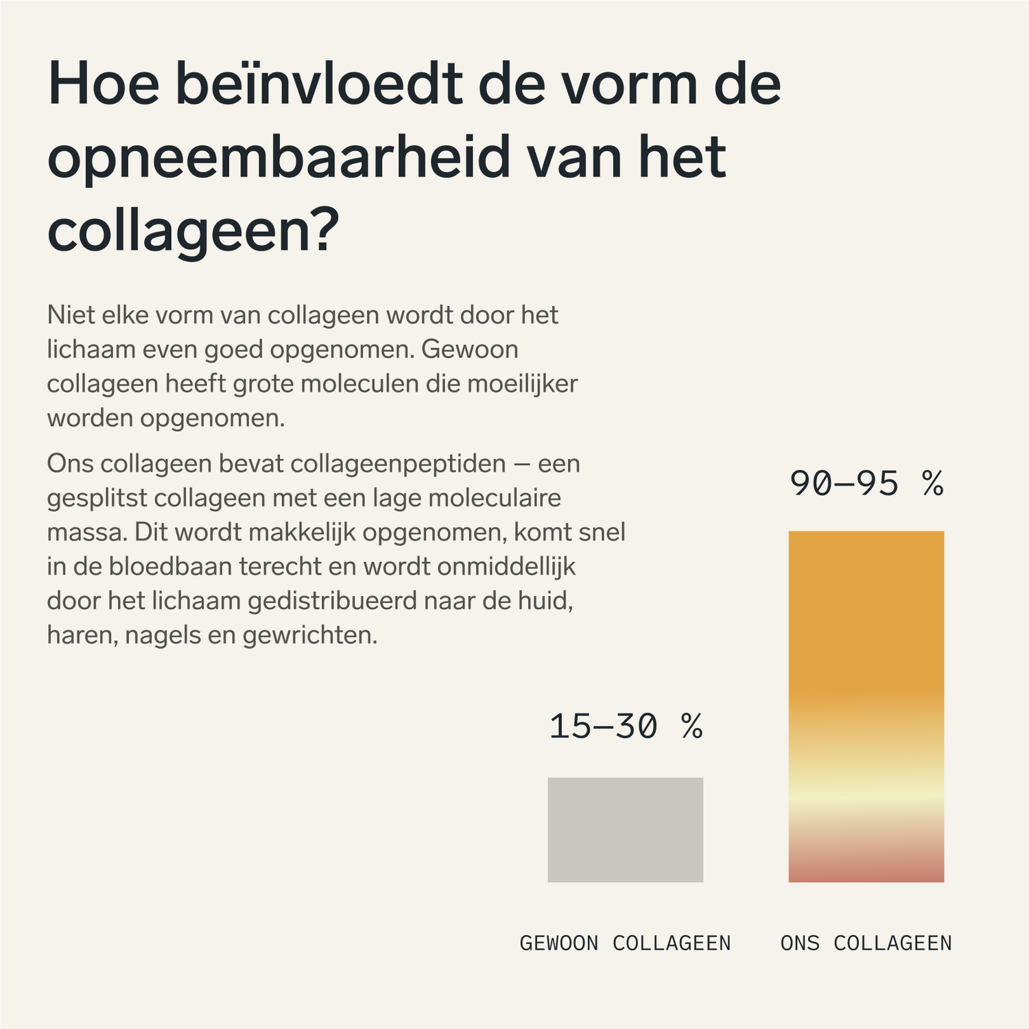 💇‍♀️ De productie van collageen vertraagt naarmate we ouder worden en daarmee verdwijnt ook geleidelijk onze jeugdige kracht. Onderzoeken wijzen uit dat de vertraagde productie al na het 25e levensjaar inzet. Maar maak je geen zorgen! Samen met de experts hebben we een unieke formule samengesteld waarin we ons eersteklas collageen hebben gecombineerd met de grootste krachtpatsers op het gebied van schoonheid die elkaar synergetisch versterken: hyaluronzuur en vitamine C en E. En ze doen hun werk meesterlijk!